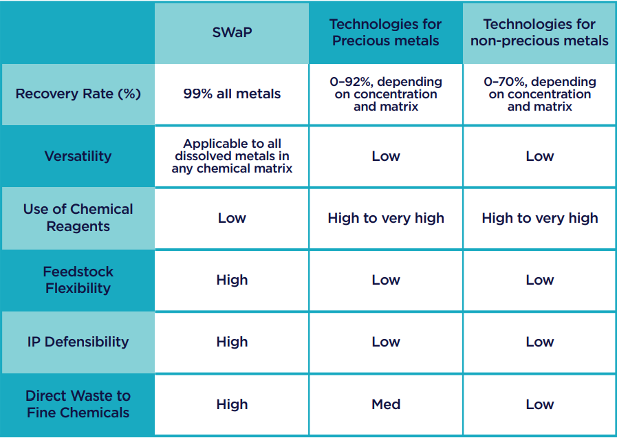 The SWaP technology, unlike traditional methods, unlocks the full value of metal-rich wastewater. It is uniquely versatile, capable of recovering both precious and non-precious metals through a single, scalable, and sustainable process.