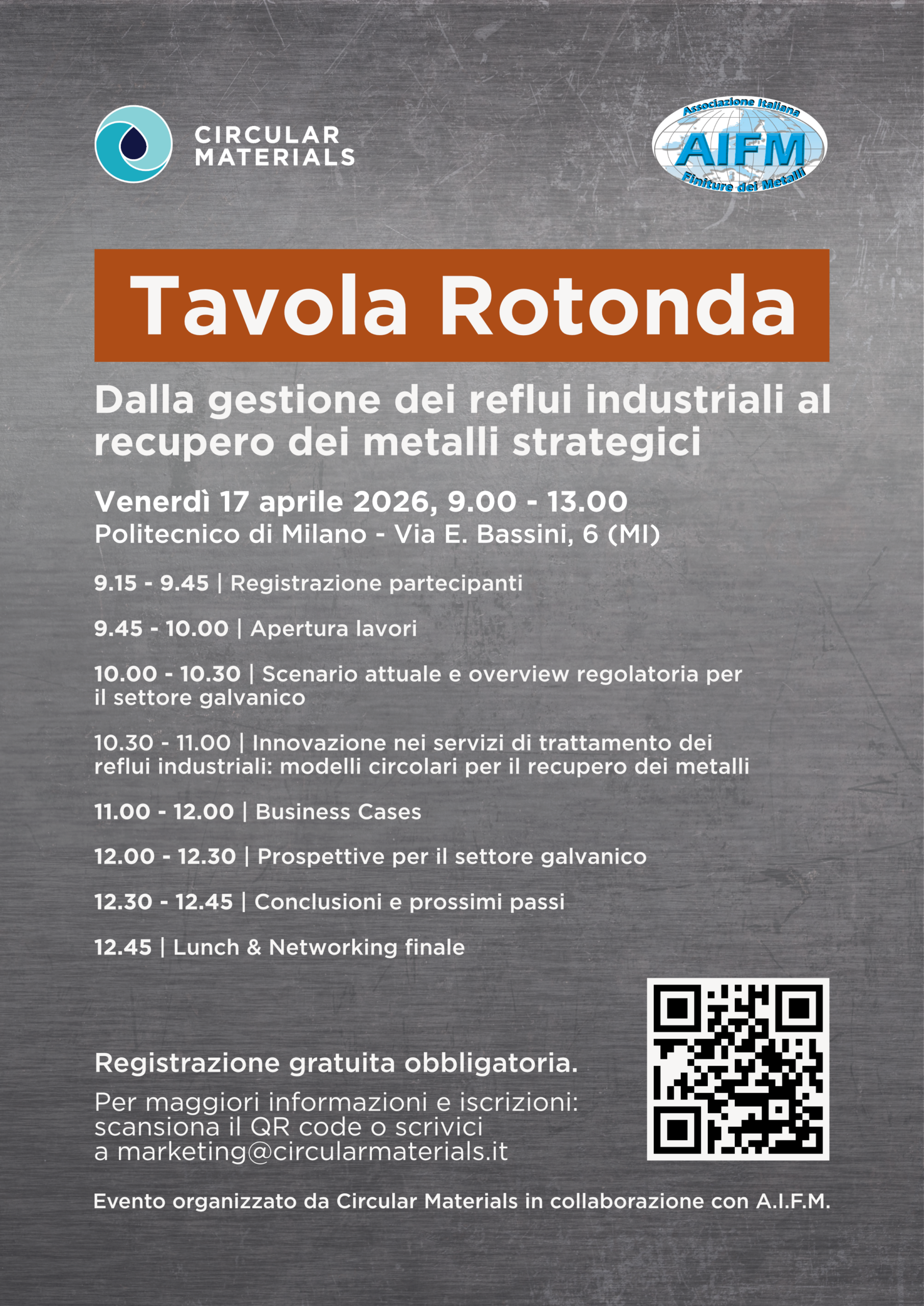 Siamo onorati di ospitare il contributo del Prof. Luca Magagnin del Politecnico di Milano e di collaborare con A.I.F.M. (Associazione Italiana Finiture Metalli) per la realizzazione di questo evento. Il valore concreto dell’incontro sarà testimoniato dalle esperienze di Argos Surface Technologies e LEM INDUSTRIES SpA, aziende leader che hanno già integrato modelli di economia circolare nei loro stabilimenti.